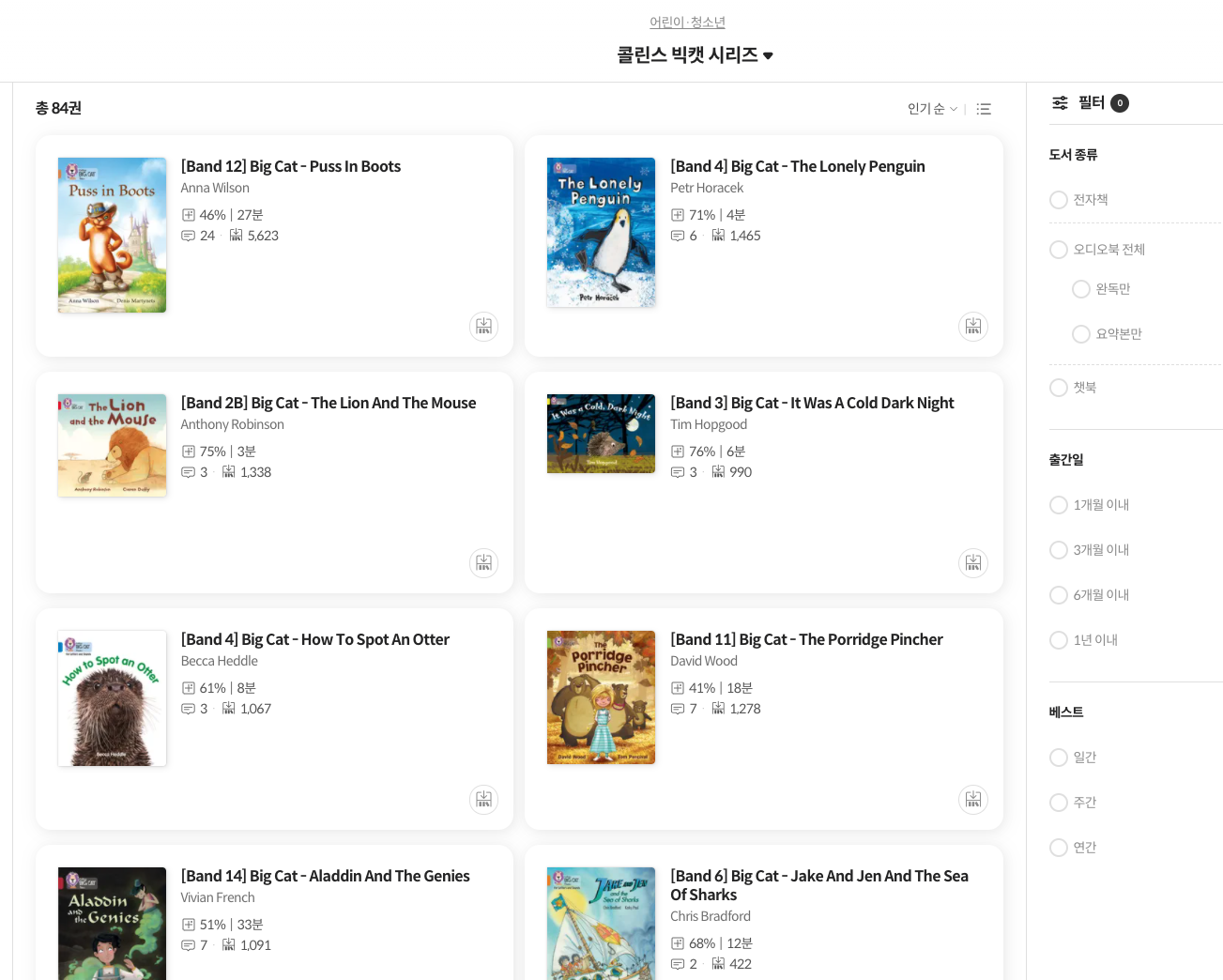 총 84권의 콜린스 빅캣 시리즈 책을 볼 수 있습니다.