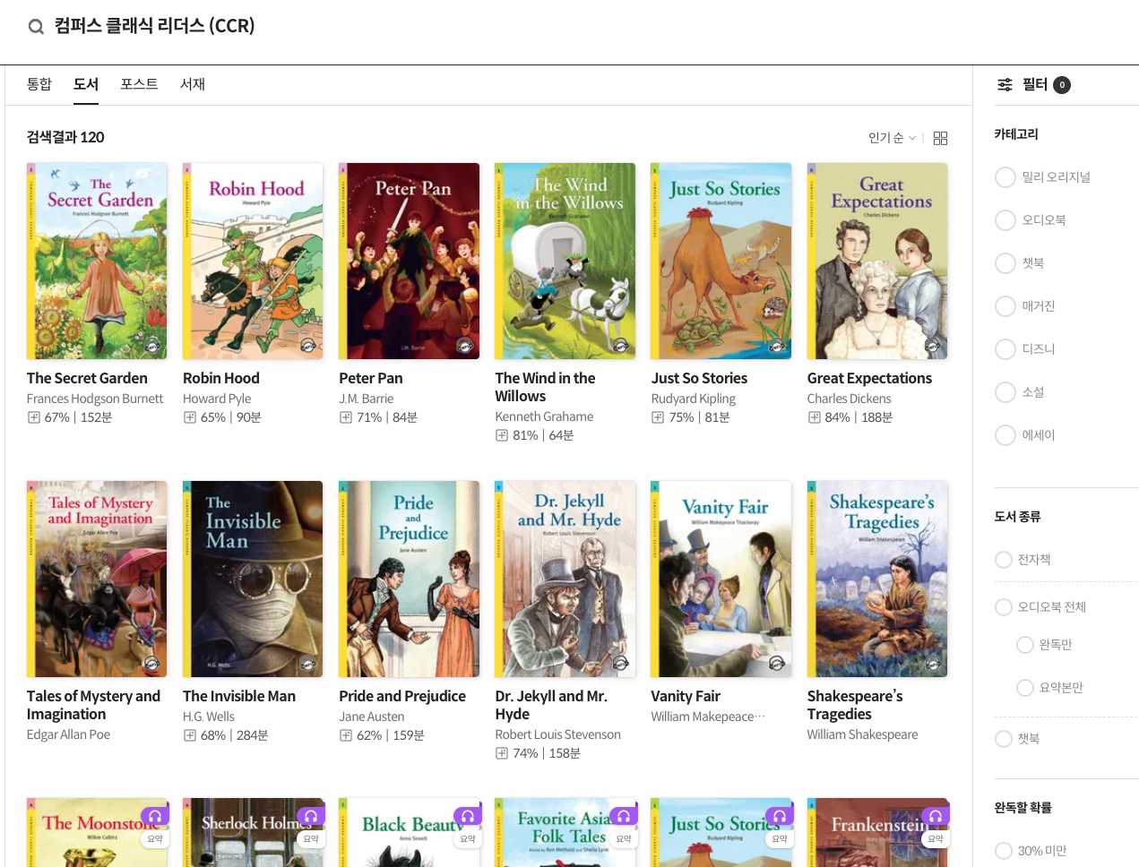 상단에 검색 창에 '컴퍼스 클래식 리더스 (CCR) 이라고 검색을 하면 영어책 120권을 볼 수 있습니다.