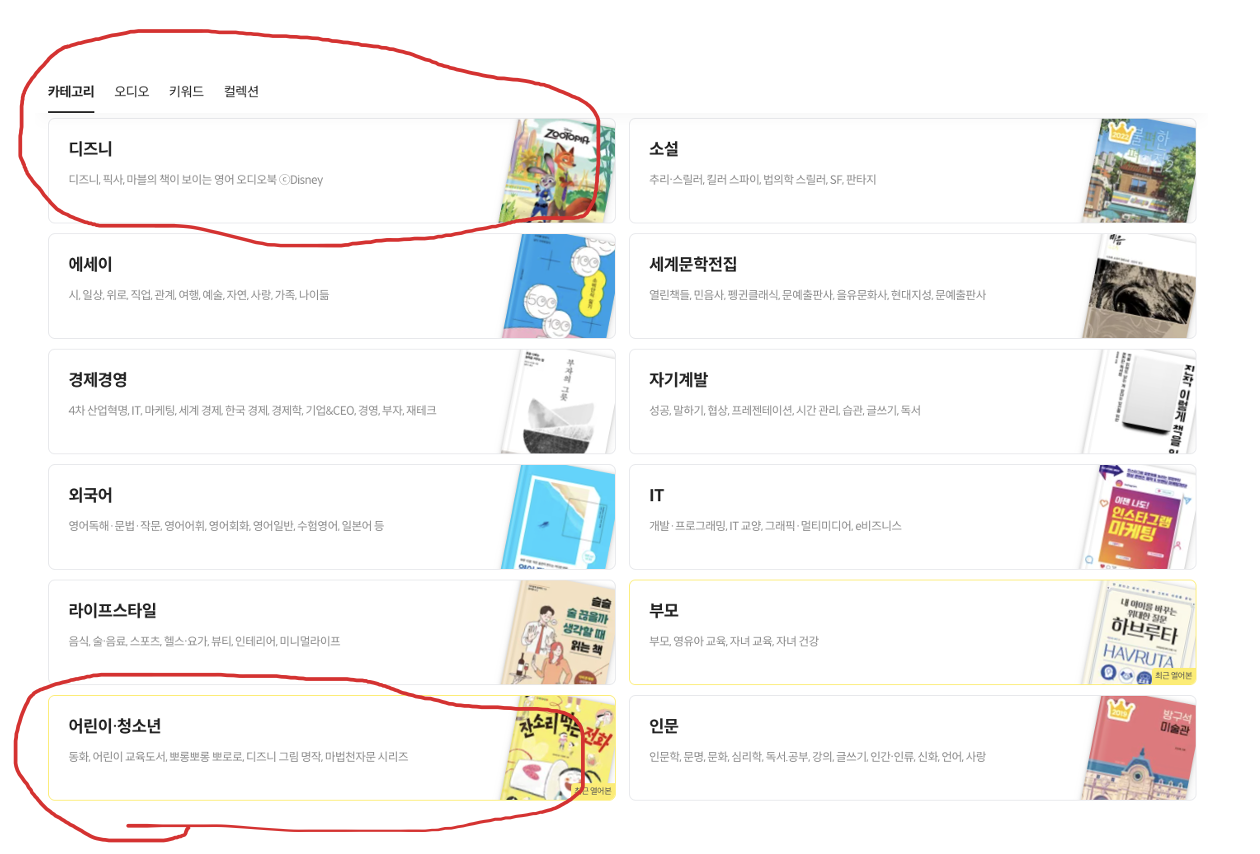 카테고리 아래 스크롤을 하면 '디즈니', '어린이청소년' 카테고리가 있습니다.