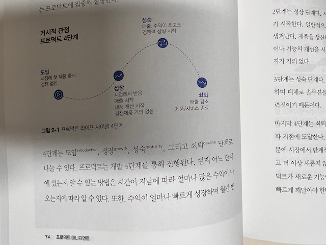 거시적 관점의 프로덕트 4단계(도입, 성장, 성숙, 쇠퇴)에 대한 설명과