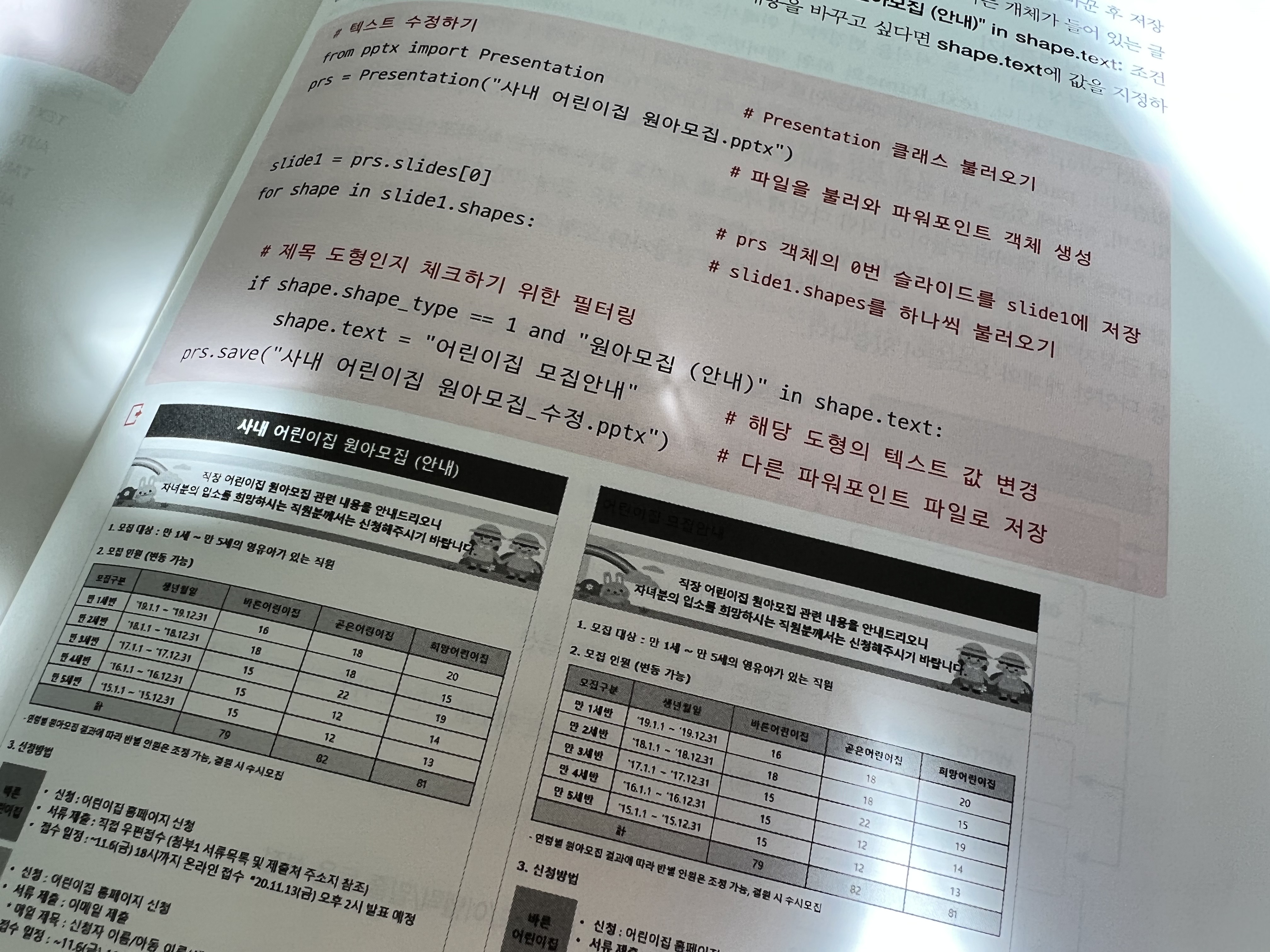 3부에서는 「파이썬으로 업무(문서(엑셀, 파워포인트), 웹크롤링 등)를 자동화하기」입니다. 이 책의 장점 중 하나로 파워포인트를 파이썬으로 수정하는 방법을 다루고 있습니다.