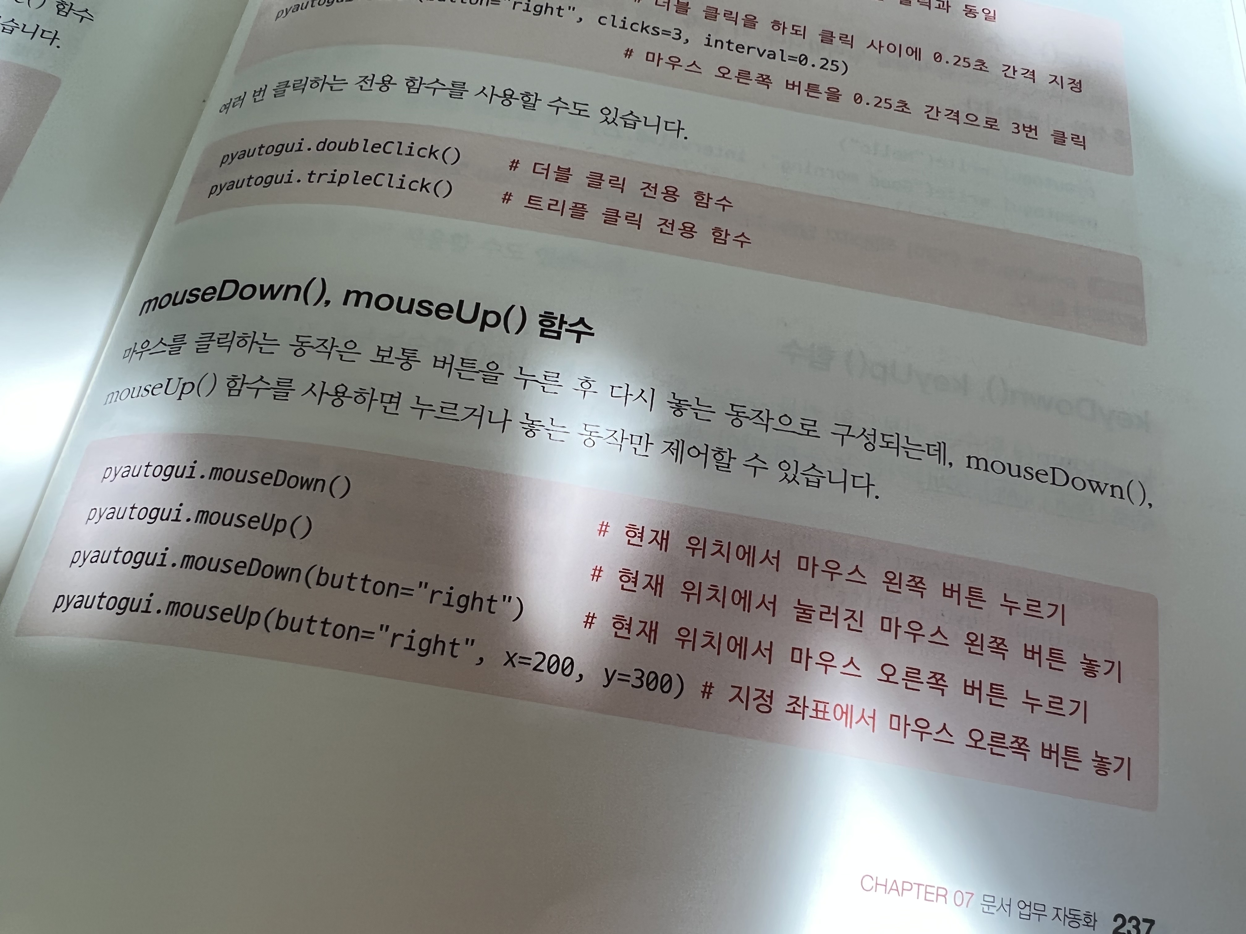 마우스, 키보드 제어, 스크린 샷 작업을 파이썬 코드로 다룹니다.