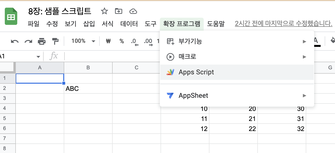 상단 메뉴에서 ‘확장 프로그램 -> Apps Script’를 선택해서