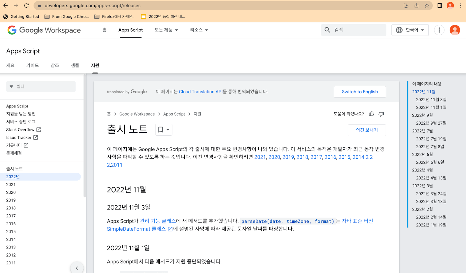 구글 앱스 스크립트가 계속 업데이트가 되고 있다는 점입니다.